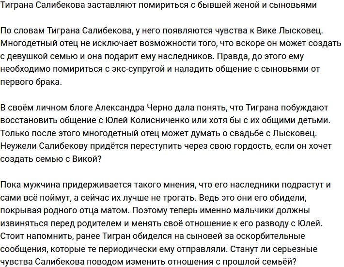 Александра Черно рассказала, что Тиграна Салибекова принуждают восстановить отношения с экс-супругой и детьми.